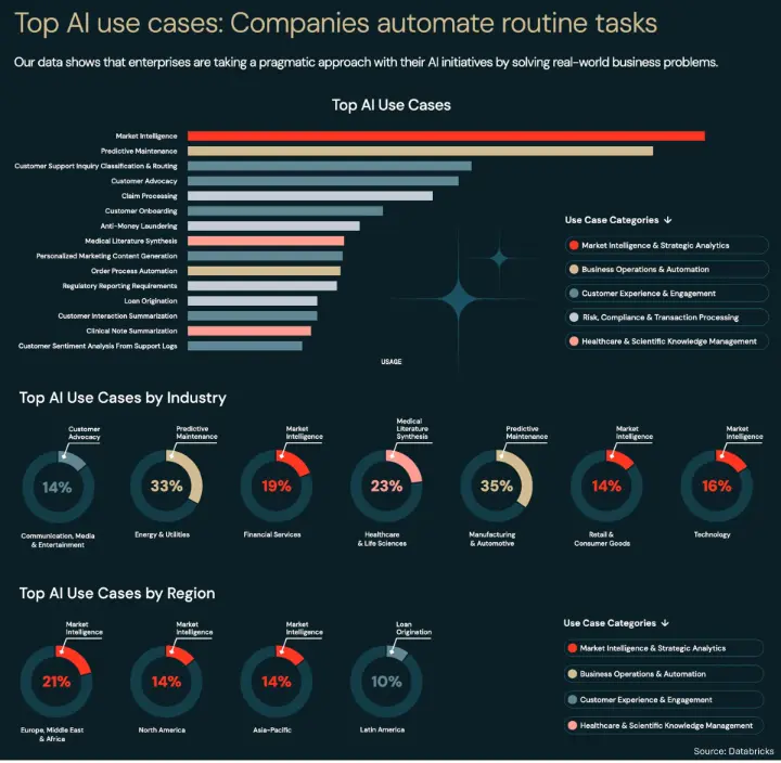The top use cases are still rooted in routine business work: market intelligence and strategic analytics, business operations and automation, and risk, compliance and transaction processing. And 40% of top AI use cases are tied to customer experience and engagement.
