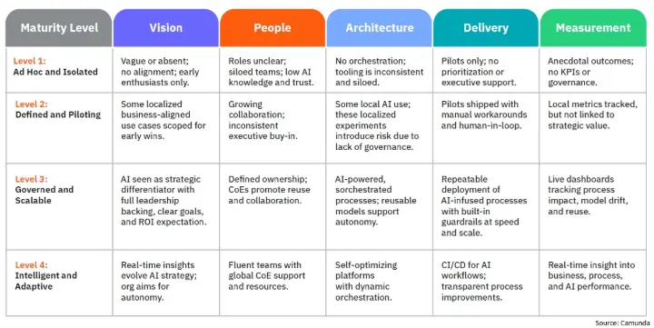 - Organizations typically evolve through four stages: Ad Hoc & Isolated, Defined & Piloting, Governed & Scalable, and finally, Intelligent & Adaptive.
